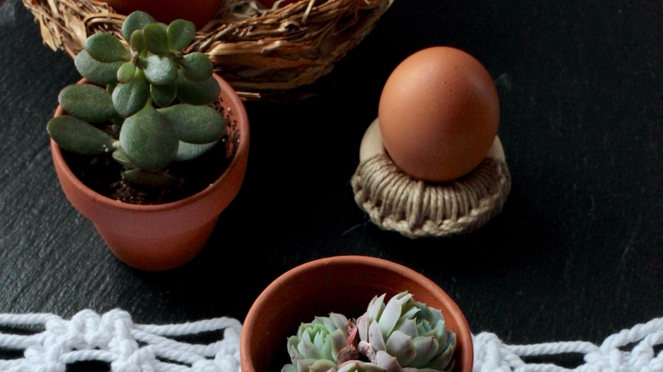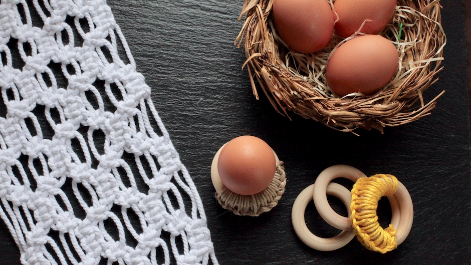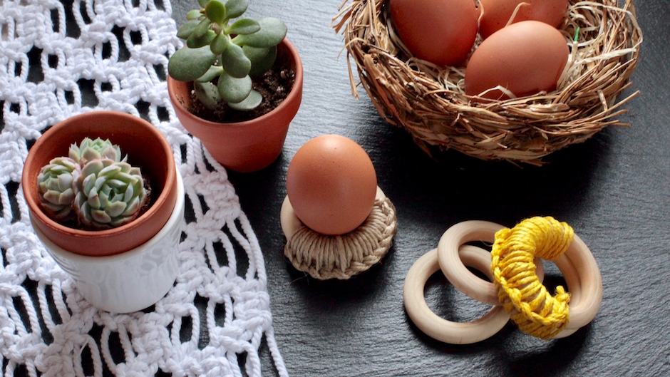Auf den Fotos kannst du überigens mein erstes selbstgeknotetes Osterdeckchen entdecken. Ein kleiner Tischläufer in Makramee Technik. Außerdem eine schnelle Last-Minute-Osteridee: Man benötigt lediglich eine Schnur und einen Ring o.Ä. Ich habe mir daher aus dem Baumarkt Holzringe für Gardinenstangen besorgt. Mit einer bunten Juteschnur werden nun jeweils zwei Holzringe mit der Knotentechnik vereint und so entsteht ganz fix ein kleiner dekorativer Eierbecher. Mit der passenden Schnur können die kleinen Eierbecher außerdem perfekt auf Farbkombination der Ostertafel abgestimmt werden. Voilà.